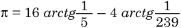 这个公式由英国天文学教授John Machin于1706年发现。他利用这个公式计算到了100位的圆周率。Machin公式每计算一项可以得到1.4位的十进制精度。因为它的计算过程中被乘数和被除数都不大于长整数,所以可以很容易地在计算机上编程实现。