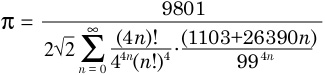 1914年,印度数学家Srinivasa Ramanujan在他的论文里发表了一系列共14条圆周率的计算公式,这是其中之一。这个公式每计算一项可以得到8位的十进制精度。1985年Gosper用这个公式计算到了圆周率的17,500,000位。