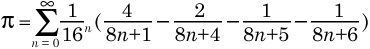 这个公式简称BBP公式,由David Bailey, Peter Borwein和Simon Plouffe于1995年共同发表。它打破了传统的圆周率的算法,可以计算圆周率的任意第n位,而不用计算前面的n-1位。这为圆周率的分布式计算提供了可行性。1997年,Fabrice Bellard找到了一个比BBP快40%的公式: