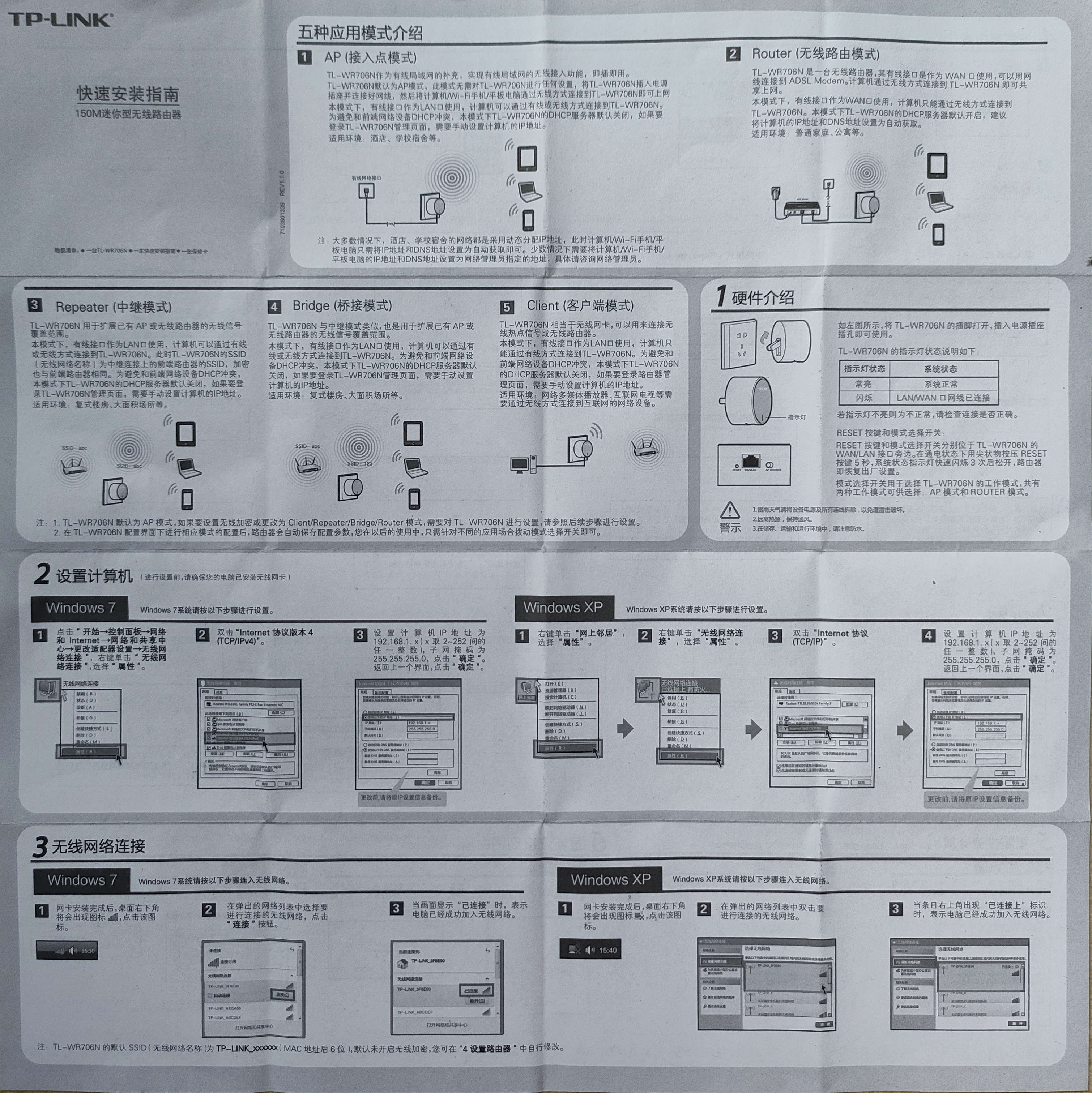 AP:接入点模式,TL-WR706N 作为有线局域网的补充,实现有线局域网的无线接入功能,即插即用。TL-WR706N 默认为AP模式,此模式无需对 TL-WR706N 进行任何设置,将 TL-WR706N 插入电源插座并连接好网线,然后将计算机/手机通过无线方式连接到 TL-WR706N 即可上网本模式下,有线接口作为 LAN 口使用,计算机可以通过有线或无线方式连接到 TL-WR706N。为避免和前端网络设备 DHCP 冲突,本模式下 TL-WR706N 的 DHCP 服务器默认关闭,如果要登录 TL-WR706N 管理页面,需要手动设置计算机的IP地址。适用环境:酒店、学校宿舍等。
