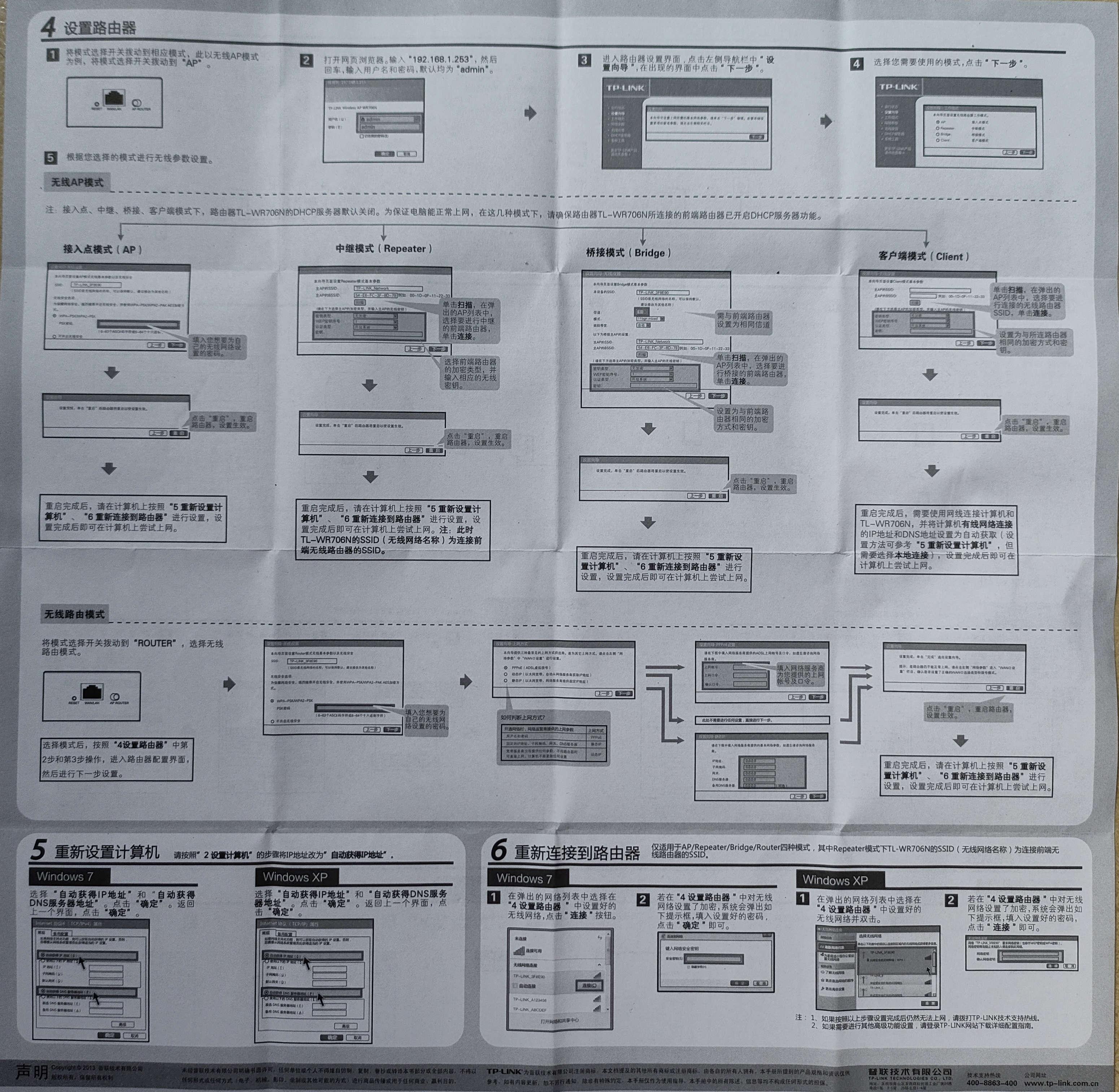 Router:无线路由模式,TL-WR706N 是一台无线路由器,其有线接口是作为 WAN 口使用,可以用网线连接到 ADSL Modem,计算机通过无线方式连接到 TL-WR706N 即可共享上网。本模式下,有线接口作为 WAN 使用,计算机只能通过无线方式连接到 TL-WR706N。本模式下 TL-WR706N 的 DHCP 服务器默认开启,建议将计算机的 IP 地址和 DNS 地址设置为自动获取。适用环境:普通家庭、公寓等。