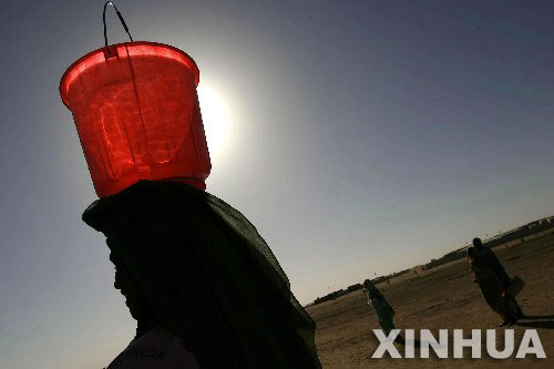 2004年12月4日,在苏丹达尔富尔地区北部的一个难民营,一名苏丹妇女顶运一桶水。