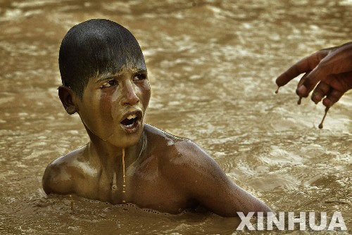 2003年5月28日,在伊拉克首都巴格达附近,一名少年在一片废水中游泳。
