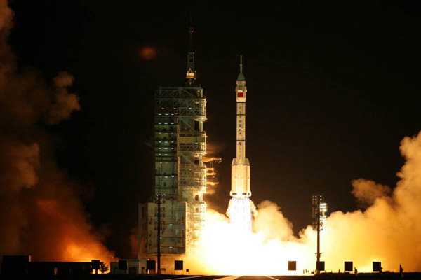 【神七飞天·火箭升空】北京时间25日21时10分许,中国第三艘载人飞船神舟七号在酒泉卫星发射中心由“长征二号F”运载火箭成功发射升空。