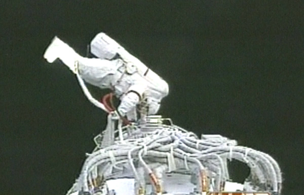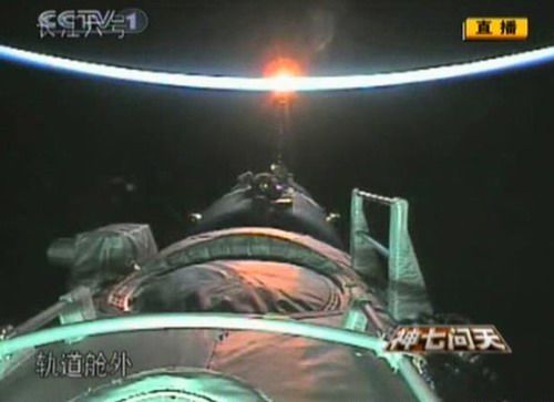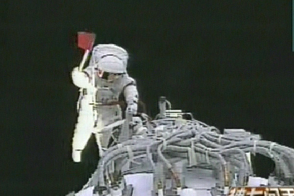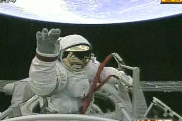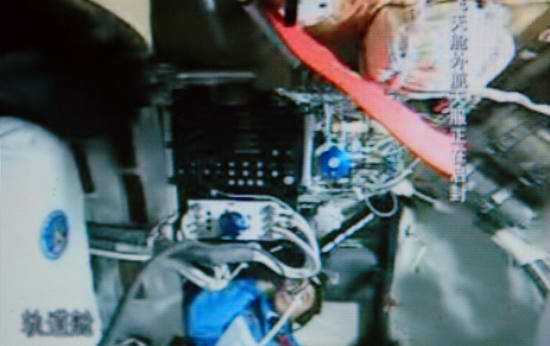【神七飞天·太空第一步】中国“神七”载人飞船航天员翟志刚27日下午16时43分左右顺利出舱,实施中国首次空间出舱活动。他半个身子先探出去,首先对着轨道舱外的摄像头挥手“打招呼”。