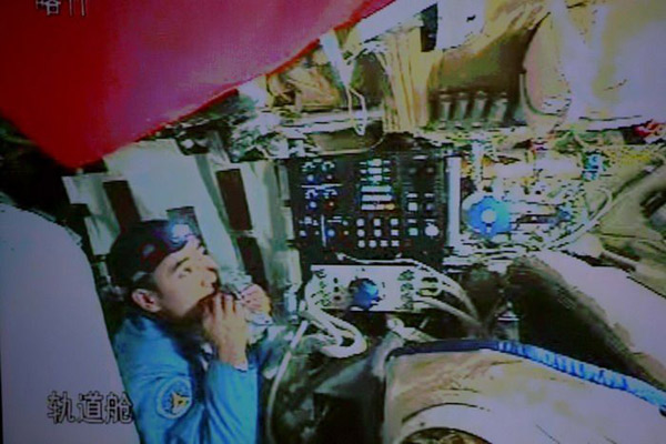 【神七飞天·调皮的勺子】航天员在返回舱内短暂休息,刘伯明把一只汤勺飘在空中,并用手拨着汤勺旋转,同在舱内的翟志刚和景海鹏相视莞尔,北京飞控中心里目睹这一幕的工作人员和记者也都忍俊不禁,并纷纷鼓掌,刘伯明自己也露出孩子般的笑容。