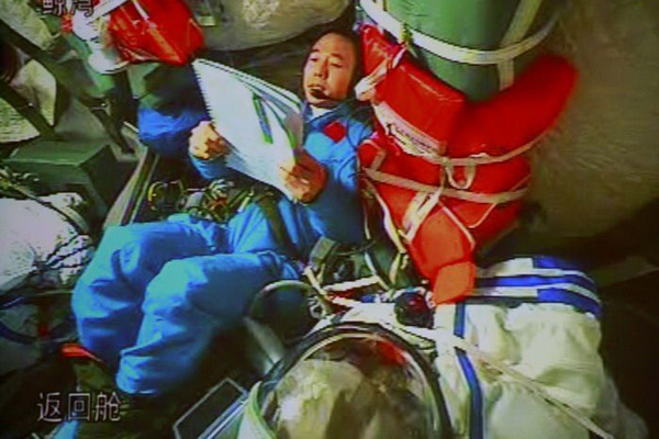 【神七飞天·轮流值班】9月26日凌晨,神七航天员更换蓝色航天服并在舱内轮流值班。图为航天员刘伯明。