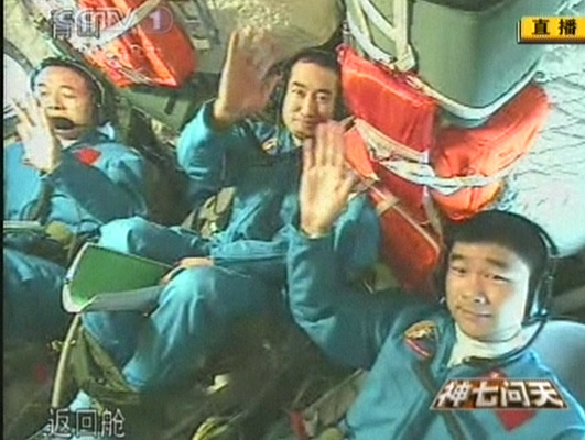 【神七飞天·向全国人民问好】北京时间9月27日傍晚,在成功实施出舱活动后,航天员回到返回舱。三位航天员向全国人民挥手问好。