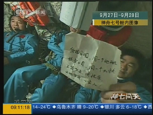 【神七飞天·太空诗人】神舟七号上的三位航天员与家人进行了天地通话。刘伯明向镜头展示的字条上面写着“俯瞰家园,同一个地球村;横望日月,同一个太空城;三马飞天,齐祝愿;天地连线,一家人。”
