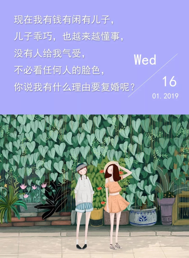现在我有钱有闲有儿子。儿子乖巧,也越来越大了,没有人给我气受,不必看任何人的脸色,你说我有什么理由要复婚呢?