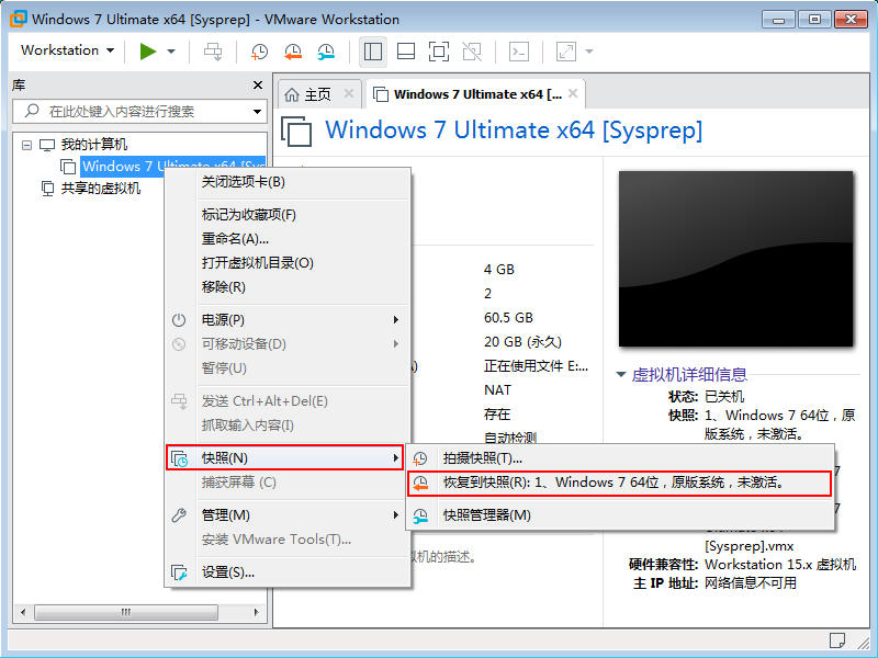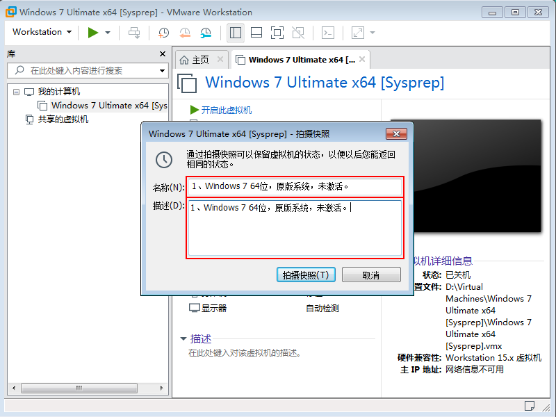 选中虚拟机,右键选择「快照」「拍摄快照」;