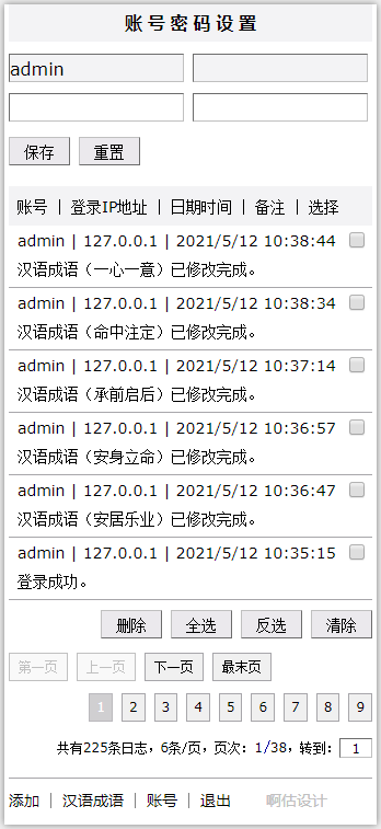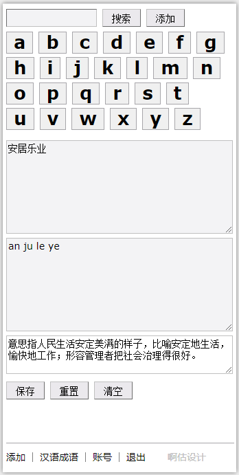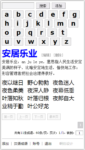 一款简单的汉语成语接龙网站系统:可以批量添加汉语成语,每个一行,添加成语时自动转换拼音,成语释义在批量添加时不会被保存。搜索功能:输入汉字或拼音进行搜索。字母索引:按汉语成语第一个字的首字母索引。单击一个成语时,就会显示以这个成语最后一个汉字的拼音开头的所有汉语成语。单用户版,登录失败锁定程序(默认:同一IP地址在2分钟以内,连续登陆失败10次,系统自动限制IP地址60分钟。)。登陆成功/失败、退出、添加/修改/删除汉语成语自动记录日志。共3个文件:ASP 程序,汉字转换拼音 JS 文件,Access 数据库。ASP 文件名称可以随意修改。修改 Access 数据库文件名称,需要打开 Index.asp 修改相应的名称。当前数据库已添加3000条左右四个汉字的汉语成语。只设计了适合在手机的浏览器访问的页面。