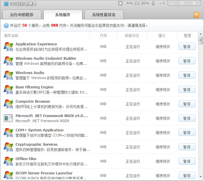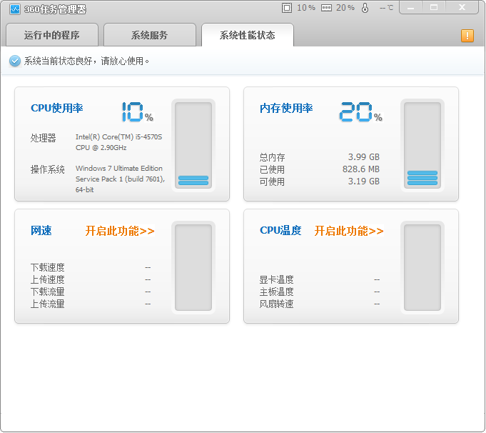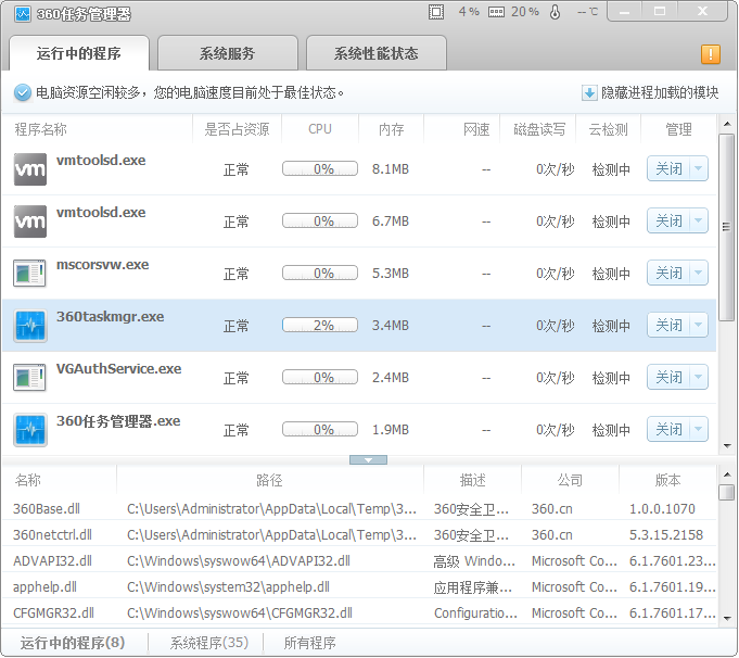 360 安全卫士 - 任务管理器,系统进程管理,系统服务管理,系统性能状态。