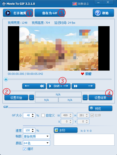 界面简单实用,用户操作方便,只需几步就能够从视频文件中截取并制作出自己的 GIF 动图文件。并且可以设置 GIF 的播放速度、画面质量和添加水印。