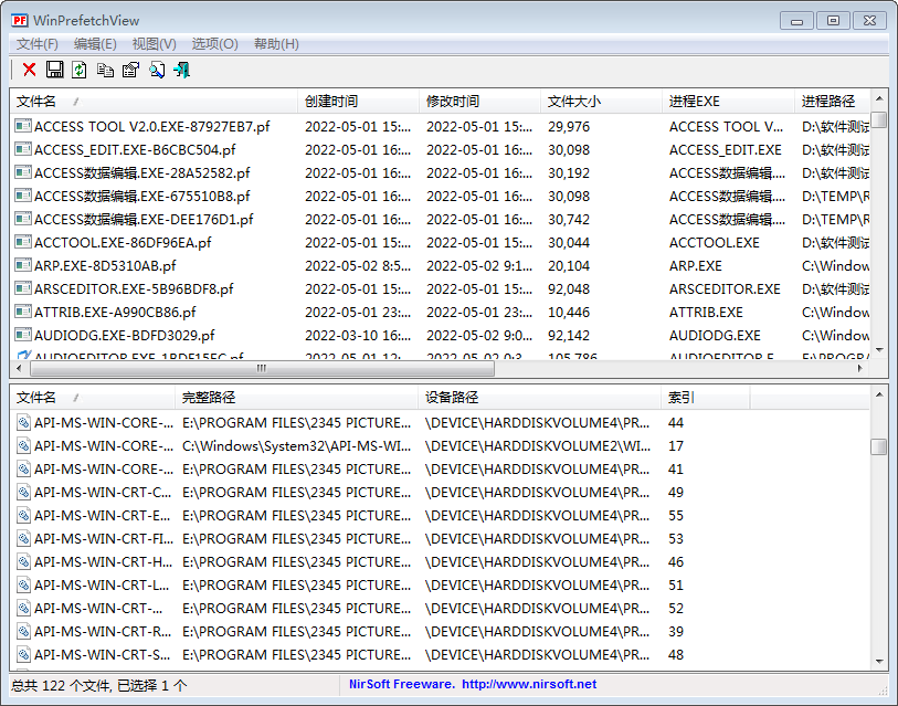 程序主窗口中包含了两个窗格:上部窗格显示了您系统中预读取文件的列表。当您选择了其中一个文件后,下部窗格会显示储存在该预读取文件中的文件信息列表。