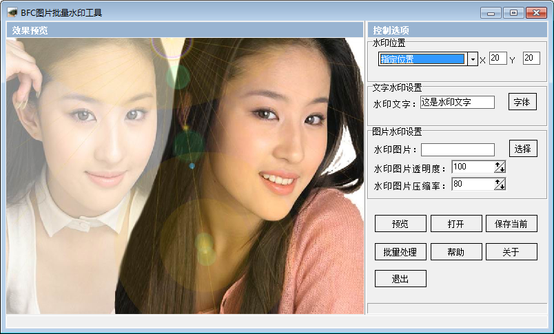 一款可以对选中的图片文件添加水印的小程序,操作非常简单,但功能还是比较强大的,批量处理图片的速度也非常快,主要特色为:可以使用本地计算机中安装的字体设置文字水印字体,具备强大的字体特效处理功能,具体性能需要用了才能体会。对于水印位置,程序内置了七个基本位置:顶部居左、顶部居中、顶部居右、底部居左、底部居中、底部居右、图片中央,此外还有一个是自定义位置,使用自定义位置时可为程序指定水印所处的坐标,可将水印添加到图片的任意位置。程序可支持文字型水印和图片型水印的添加,使用图片水印时需要删除文字水印内容,并选择好作为水印的图片。 |