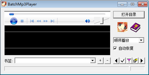 背景音乐播放器。简单到只需要点一个按钮,就可以自动播放若干级子目录下的所有音乐文件,没有必要一个目录、一个目录地添加,更没有必要生成“播放列表”之类的东西。具有“自动恢复”功能,下次启动时,可以从上次退出时播放的地方开始播放。可以建立书签,以后从列表中选择书签即可从建立书签处开始播放。支持顺序播放、循环播放、随机播放,而且基于微软稳定的媒体播放控件,连续播放一天都没有问题,特别适合播放背景音乐。