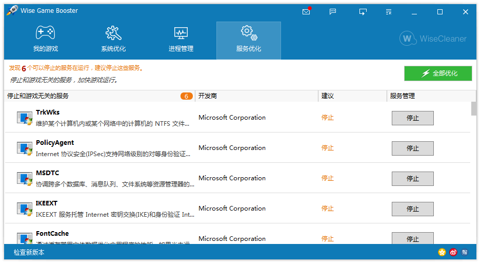 在“进程管理“和”服务优化“中,Wise Game Booster会提供一些有用的建议,便于高级用户手工结束进程或者停止服务。有时,停止某个服务会影响系统性能,为了确保安全,Wise Game Booster 会备份优化的服务,便于还原到优化前的状态。
