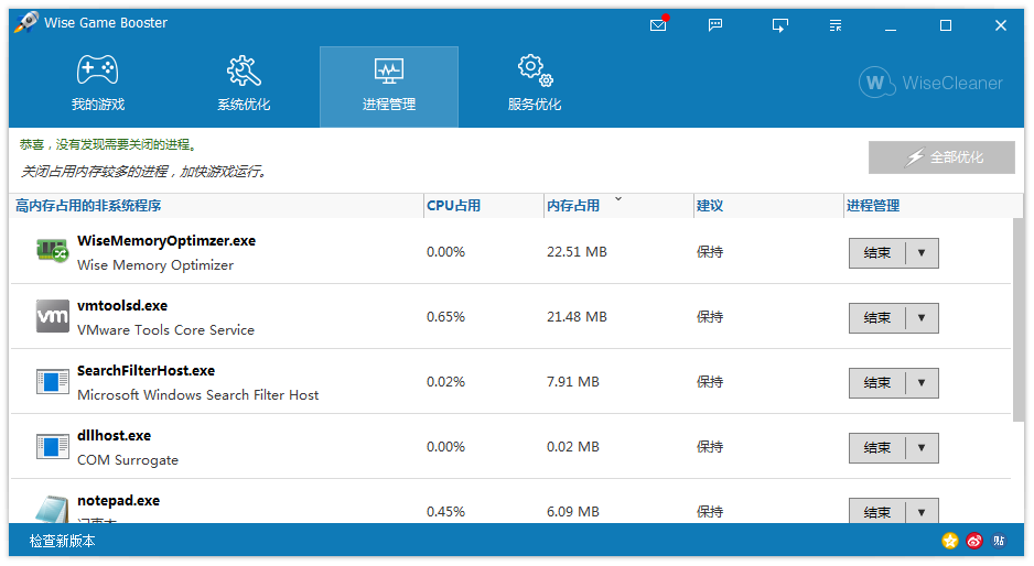 Wise Game Booster 不会制造奇迹,它只会帮你找出系统中每一份可用的资源,通过结束这些无用的进程和服务,将这些释放出来的资源提供给游戏程序。说起来很简单,但却非常有效。