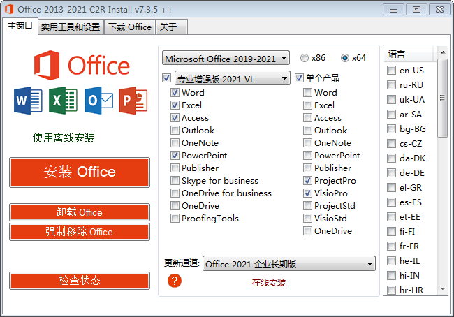 Office 2013-2021 C2R Install 是一款 Office 软件下载神器,是一款非常实用的 Office 办公软件自定义下载安装激活工具,还可以用于 Office 2013-2021 离线安装包的组件自定义安装,功能异常的强大,为用户提供 Office 2013、Office 2016、Office 2019、Office 2021 几款办公套件的下载安装激活服务,或许你只想安装 Word/Excel/PowerPoint 里的其中一款软件,它也能够让您自定义安装,就是这么强大。