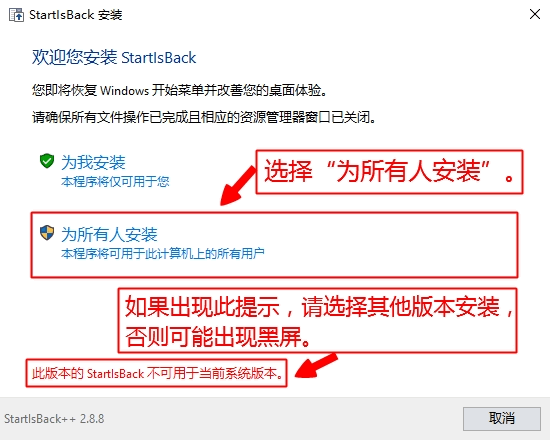 压缩包中包含多个版本的安装程序,安装时必须选择“为所有人安装”,如果出现“此版本的 StartIsBack 不可用于当前系统版本”的提示,请选择其他版本安装。安装后如果屏幕闪烁或者黑屏,屏幕提示“Hold Escape key to prevent StartIsBack from loading”,这时按 ESC 键几下就能恢复正常。