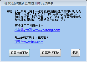 不过卸载补丁非常耽搁时间。所以我整合了一个一键修复最近出现的系统更新后无法共享打印机问题的工具。这个工具可以在线修复和离线修复,精简母盘时可以对挂载的母盘进行离线修复。本人最近精简的母盘就是用的这个工具离线修复的。
