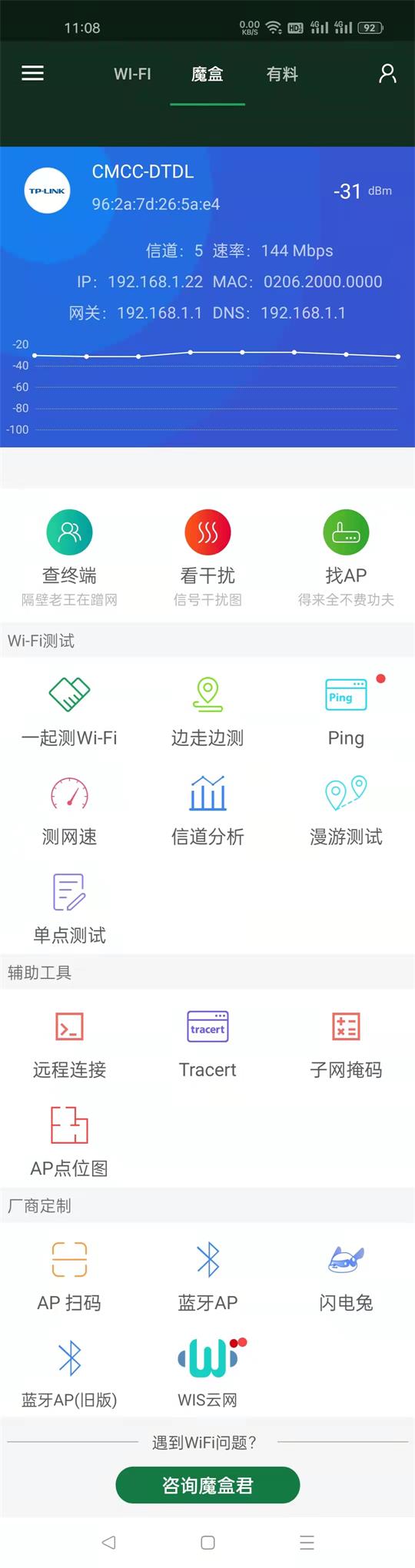 WiFi 魔盒,一款专业又有趣的 Wi-Fi 检测工具,无线终端软件,支持 Android、iOS 等平台,是移动端的专业 Wi-Fi 检测、诊断和优化工具,同时提供各种无线网络交付、测试、优化和移动运维的小工具。
