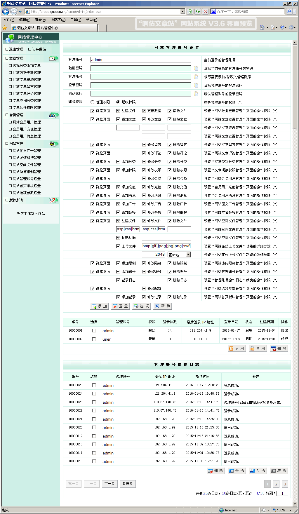 •网站管理账号设置:网站管理账号,添加/修改(密码/权限)/删除,不同的管理账号对后台页面(功能)的浏览、添加、修改、删除权限可以分别设置(包括设置允许添加/修改的文章类别/分类的编号,允许在线上传的文件类型、文件大小等),查看/删除管理账号操作日志(登录成功、登录密码/验证码错误、修改管理账号密码/权限、删除操作日志都会记录)。