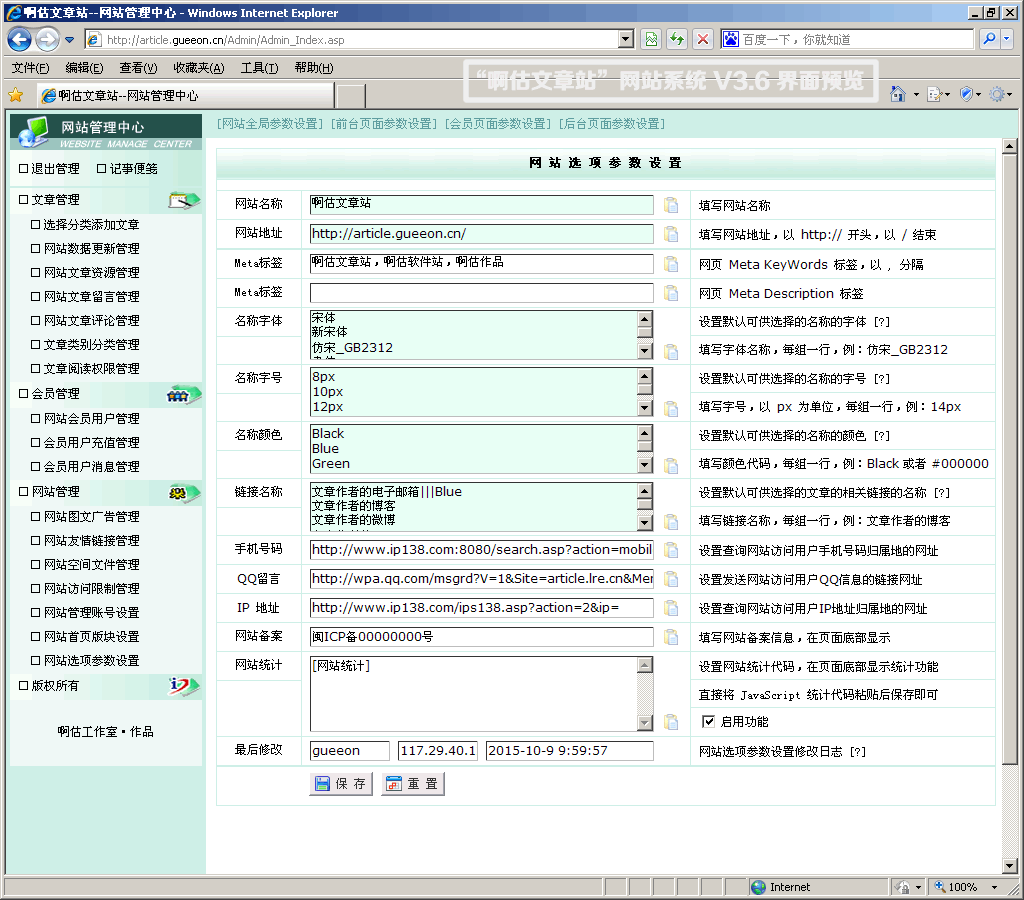 •网站选项参数设置:进入网站选项参数设置页面,即可设置网站名称、网址、备案信息、统计代码等等,设置前台页面的参数(包括防 SQL 注入过滤功能、首页的消息公告、文章内容敏感字符过滤替换功能,会员系统参数等等),设置后台页面的参数(包括设置文章图片、广告图片、友情链接图片允许添加的图片类型、默认的图片上传文件夹等等)。