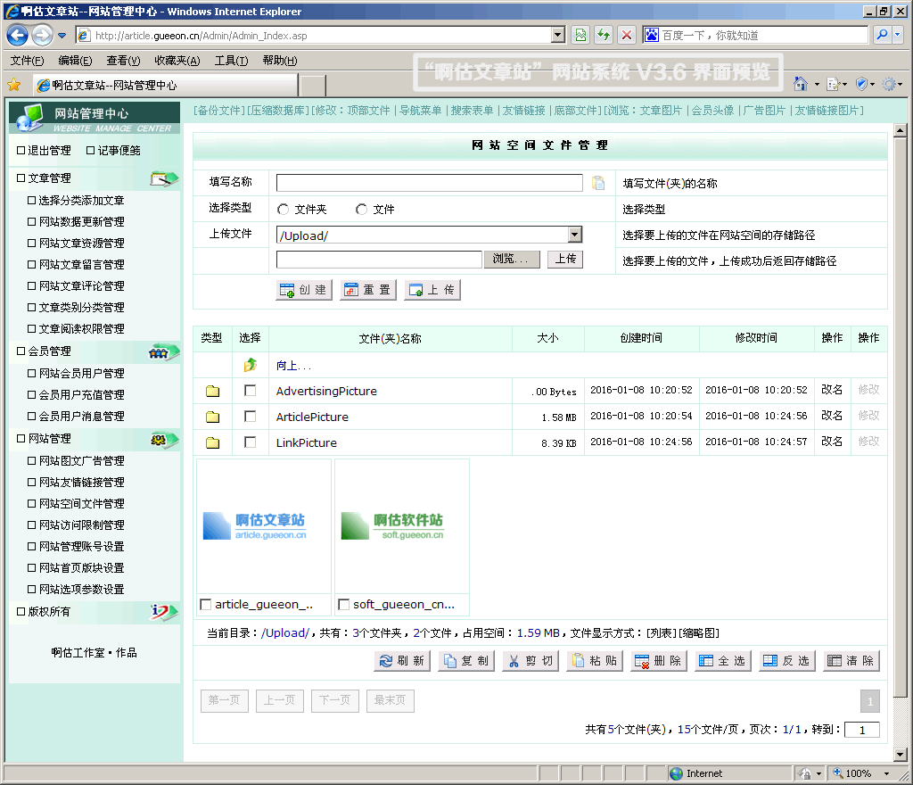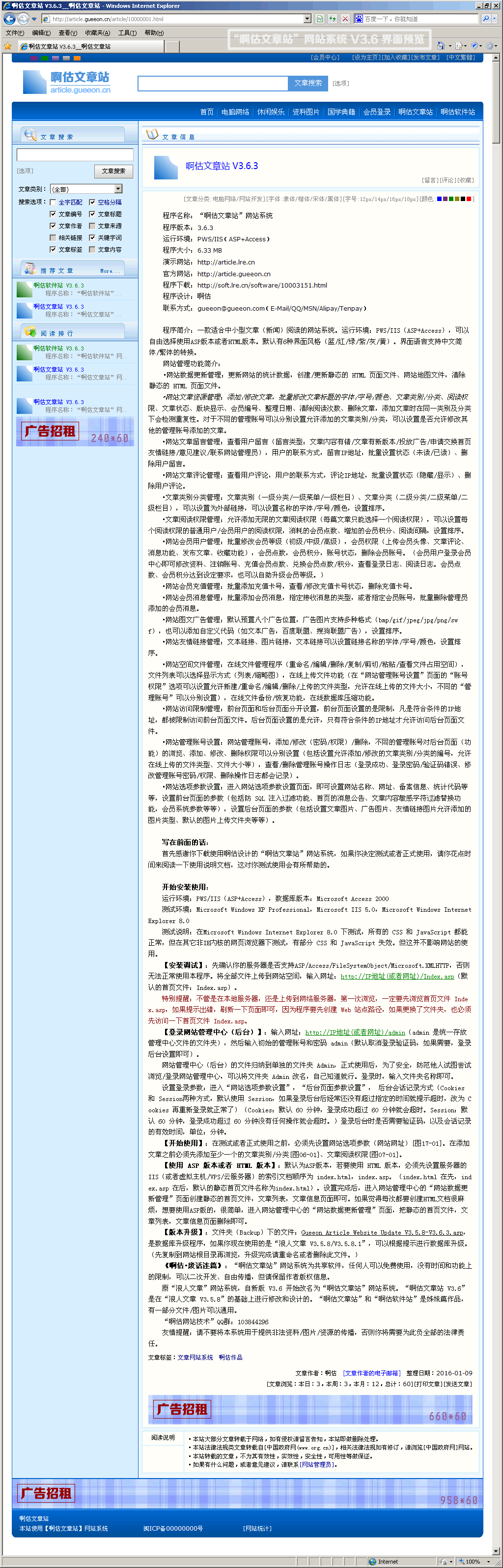 【版本升级】:文件夹(Backup)下的文件:Gueeon_Article_Website_Update_V3.5.8-V3.6.3.asp,是数据库升级程序,如果你现在使用的是“浪人文章 V3.5.8/V3.5.8.1”,可以根据提示进行数据库升级。(先复制到网站根目录再浏览,升级完成请重命名或者删除此文件。)