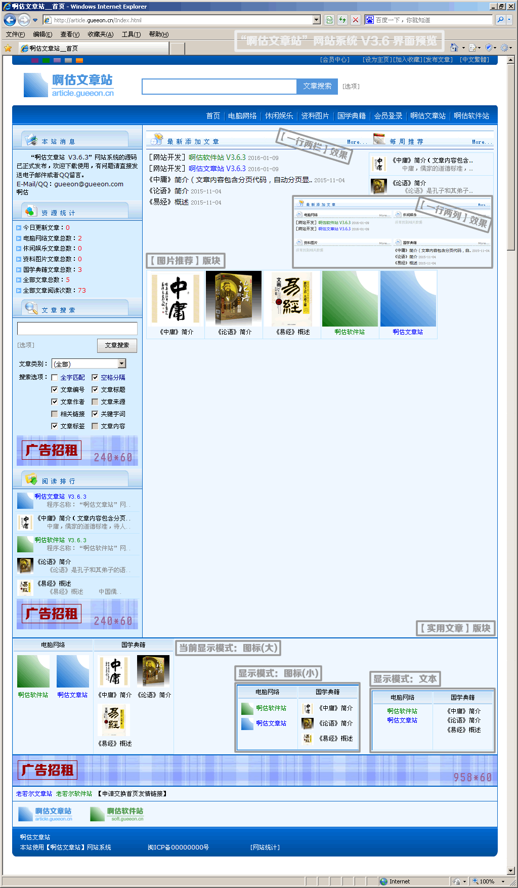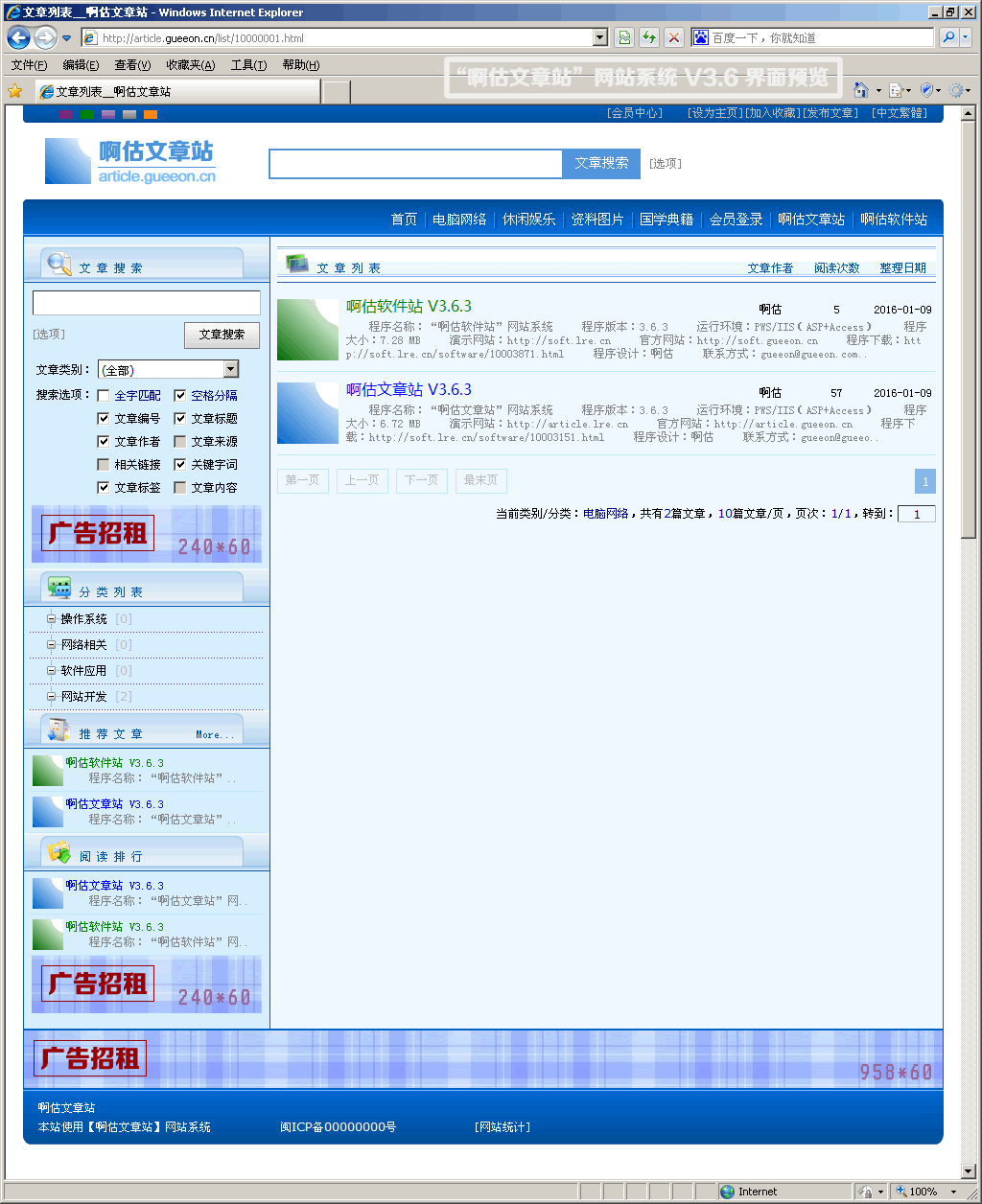 原“浪人文章”网站系统,自新版 V3.6 开始改名为“啊估文章站”网站系统。“啊估文章站 V3.6”是在“浪人文章 V3.5.8”的基础上进行修改和设计的。“啊估文章站”和“啊估软件站”是姊妹篇作品,有一部分文件/图片可以通用。
