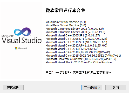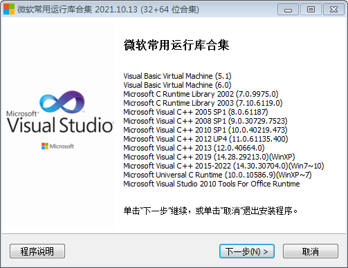 Windows 系统运行库,就是支持大部分软件运行的基础!微软常用运行库合集,这些运行库都是采用 Microsoft Visual Studio 20XX 编写的软件必须使用的公用 DLL 运行库,相当于程序的字典文件,某些网上和论坛的部分精简软件没有附带这些公用 DLL,所以安装这些运行库是系统安装后第一件要做的事情;某些程序在64位系统下运行任然需要32位的运行库,因为程序是基于32位 Visual Studio 开发的,典型的例子比如QQ。静默参数:/SILENT 显示窗口直接安装,/VERYSILENT 静默安装