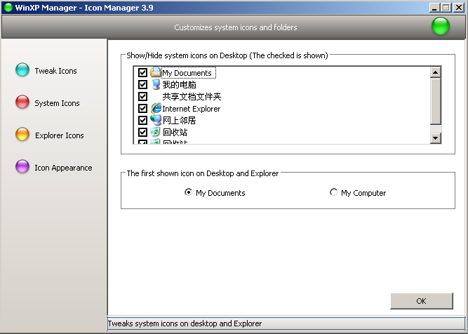 4、个性设置:个性化鼠标右键菜单内容;图标管理器可以随意地设置、更改系统中的各种图标;自定义系统桌面、菜单、工具栏及通知区域的许多功能,更改 Windows 登录图案以及自定义您的 OEM 信息 ;在后台自动地更换桌面墙纸图案。