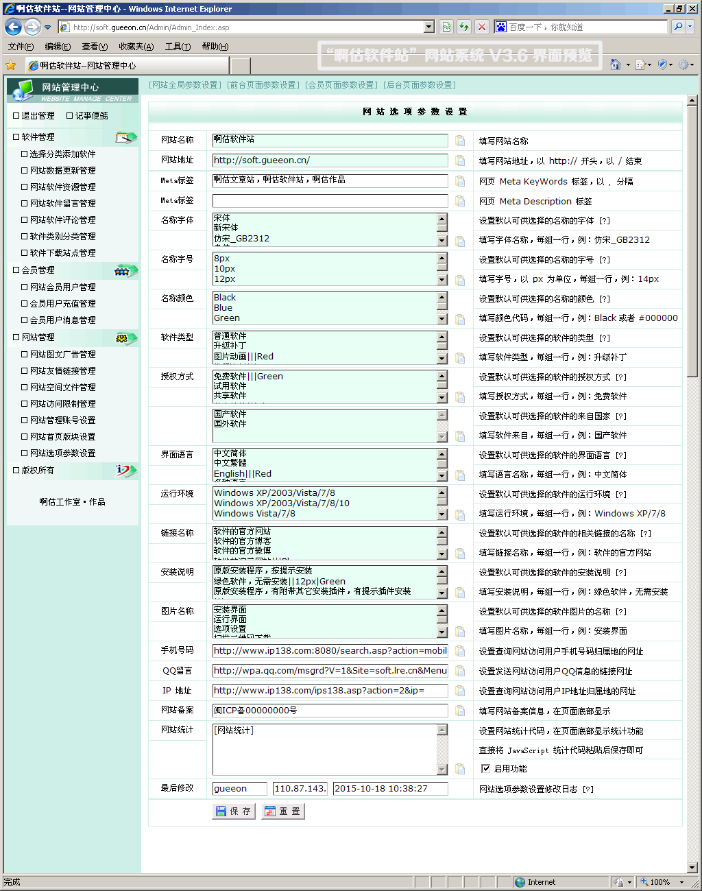 •网站选项参数设置:进入网站选项参数设置页面,即可设置网站名称、网址、备案信息、统计代码等等,设置前台页面的参数(包括防 SQL 注入过滤功能、首页的消息公告、软件简介敏感字符过滤替换功能,会员系统参数等等),设置后台页面的参数(包括设置软件图片、广告图片、友情链接图片允许添加的图片类型、默认的图片上传文件夹等等)。