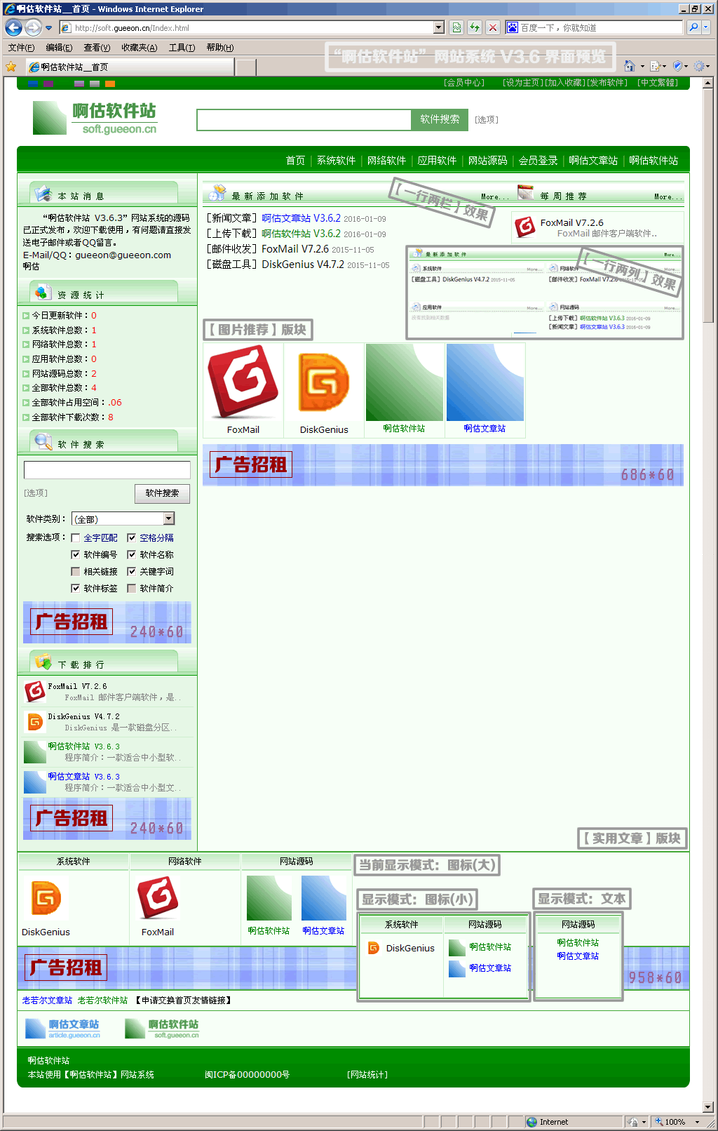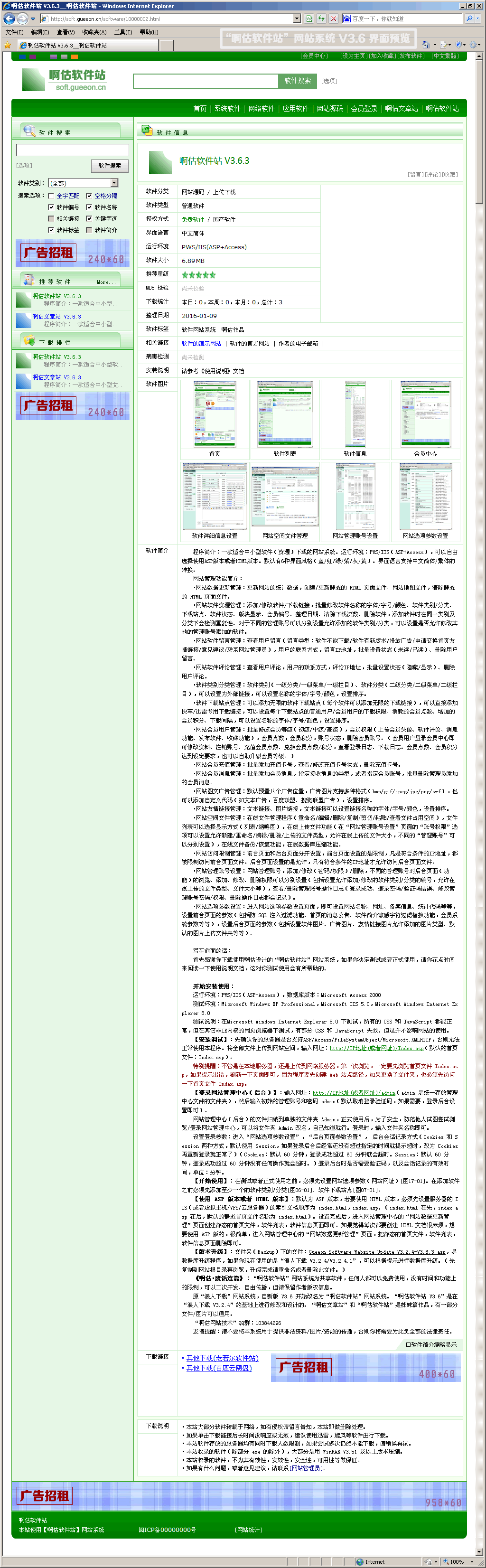 原“浪人下载”网站系统,自新版 V3.6 开始改名为“啊估软件站”网站系统。“啊估软件站 V3.6”是在“浪人下载 V3.2.4”的基础上进行修改和设计的。“啊估文章站”和“啊估软件站”是姊妹篇作品,有一部分文件/图片可以通用。