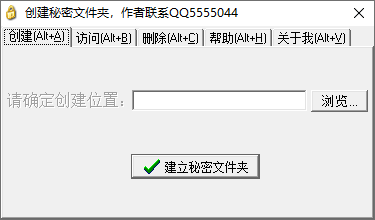 程序功能简介:使用本程序创建一个秘密文件夹,首先选择创建位置,然后会在所选目录下产生一个名字为 mwy 的秘密文件夹,这个文件夹无法正常访问和删除,必须使用本程序提供的访问和删除功能进行操作,如果别人没有此软件就很难获取 mwy 文件夹里的内容,这样就起到了加密作用!
