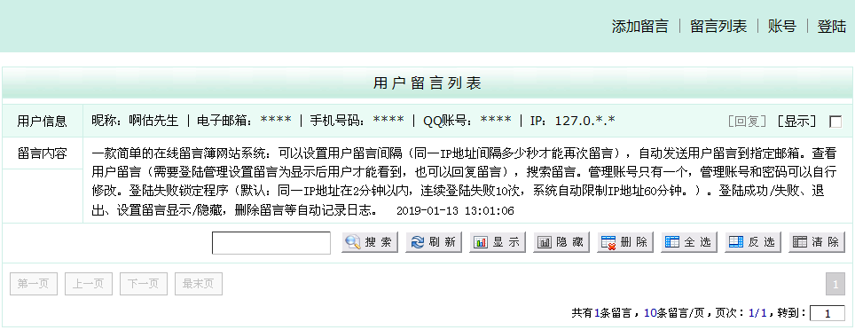 一款简单的在线留言簿网站系统:可以设置用户留言间隔(同一IP地址间隔多少秒才能再次留言),自动发送用户留言到指定邮箱。查看用户留言(需要登陆管理设置留言为显示后用户才能看到,也可以回复留言),搜索留言。管理账号只有一个,管理账号和密码可以自行修改。登陆失败锁定程序(默认:同一IP地址在2分钟以内,连续登陆失败10次,系统自动限制IP地址60分钟。)。登陆成功/失败、退出、设置留言显示/隐藏,删除留言等自动记录日志。
