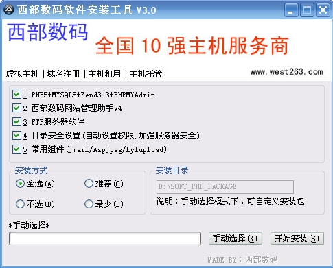 西部数码软件安装工具 V3.0 适用于:Windows 2003(IIS 6.0),大小:27 MB