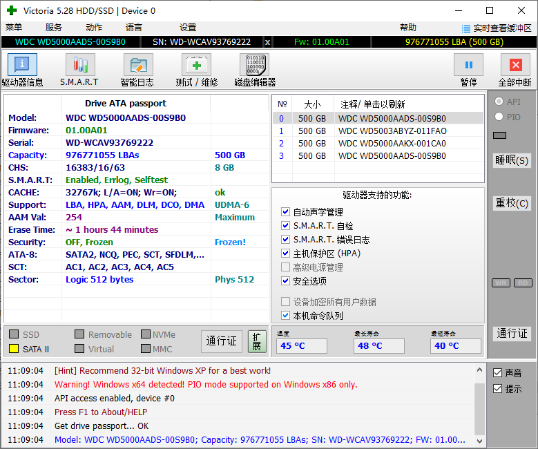 HDD PIO模式除了通过Windows API进行操作外,该程序还具有PIO模式:绕过Windows和BIOS,直接通过端口访问经过测试的IDE / SATA驱动器。同时,Victoria本身 完全实现了与设备一起使用的物理协议,当驱动程序无电时,该协议允许访问部分故障的设备。