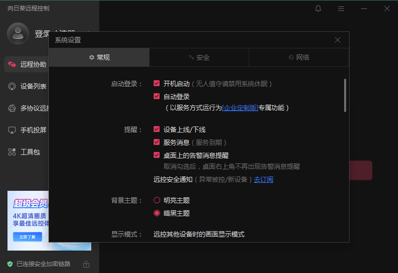 特别提醒:V3.2 绑定账号时,如果使用账号和密码登录会提示“主机数量超出了限制”,此时只要用葵码绑定,即可正常登录,并设置隐藏系统托盘图标。主机葵码:登录向日葵管理后台,添加设备即可创建葵码。还有一种方法:先安装更高版本的向日葵客户端,并用账号和密码登录,登录成功,也能看到葵码,然后用此葵码即可绑定。绑定成功后,我尝试版本更新,升级到 V5.4.3.18234,重启后,发现系统托盘图标还是隐藏的。2025-07-16