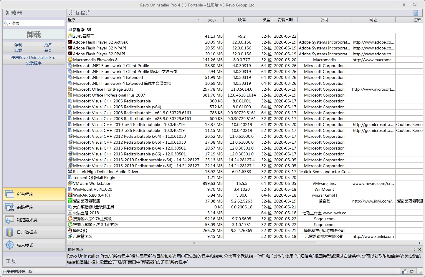 一款创新的卸载程序,可帮助您卸载不必要的软件并删除个人计算机上安装的不需要的程序。为您提供了优化设备的便利,以及摆脱所有不需要的程序文件并减慢计算机进程的速度。 您可能会惊讶地发现Windows控制面板中的“添加/删除程序”选项并不总是完全从系统中删除所有软件数据。注册表项或程序文件和文件夹之类的跟踪可能仍然存在。现在使用 Revo Uninstaller 您可以确保可以从所有这些残留物中清理系统,并为您的设备提供更多的舒适性和优化。(中文绿色注册版)
