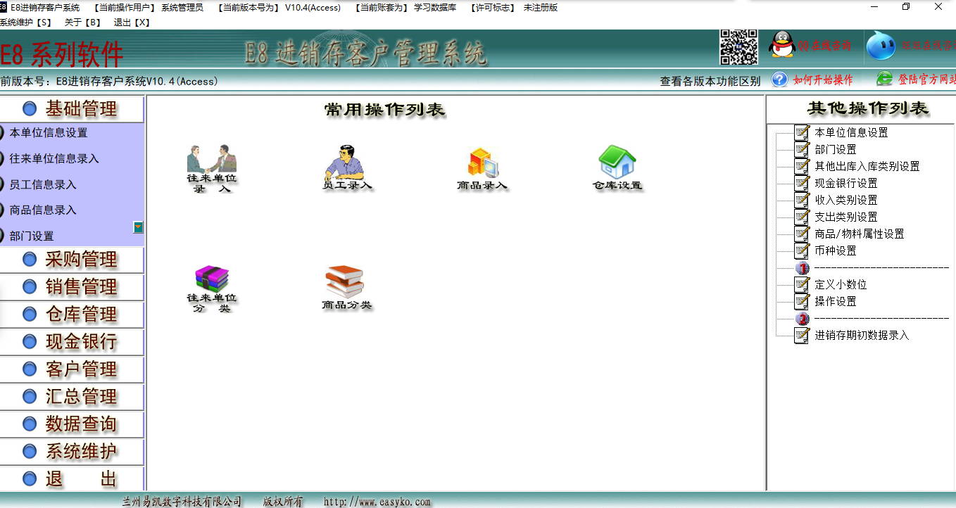 E8 进销存客户管理软件是集进、销、存、客户管理于一体的软件,特别为中小企业设计,它的功能范围包括进货管理、销货管理、退换货管理、应收应付款的管理、库存管理、营销设置、营销分析,并配备有功能完整、全面的经营报告系统及营销分析系统(收支明细表、进货明细表、销货明细表、库存一览表、货品进销一览表、货品销售排行榜、经营状况表、各类营销分析表、各类营销排行表、多功能核算库存成本等)。具有超强穿透力的查询功能,使您可以追溯到发生过的任何一笔业务,安装后马上可以开始使用,是一款即装即用的软件。它的功能覆盖了中小型企业财务管理、货品进销存管理及营销自动分析的方方面面,是一款非常实用的软件。同时本软件具有最低销售限价功能、客户最大欠款限制机制、负数出库与非负数出库自动切换、出库入库价格跟踪、定义商品自动打折时间及折扣的功能。只要录入各类单据,其他各类统计表、汇总表、营销分析表均会自动生成,省时省力。本软件具有可以按客户、商品、业务员、部门等多种销售排行表的功能,及大的方便了企业销售决策。网络版中独特的通过普通宽带(如ADSL)连接远程数据库,轻松实现广域网(互联网)上数据共享操作,为用户节省巨大宽带租用费用。