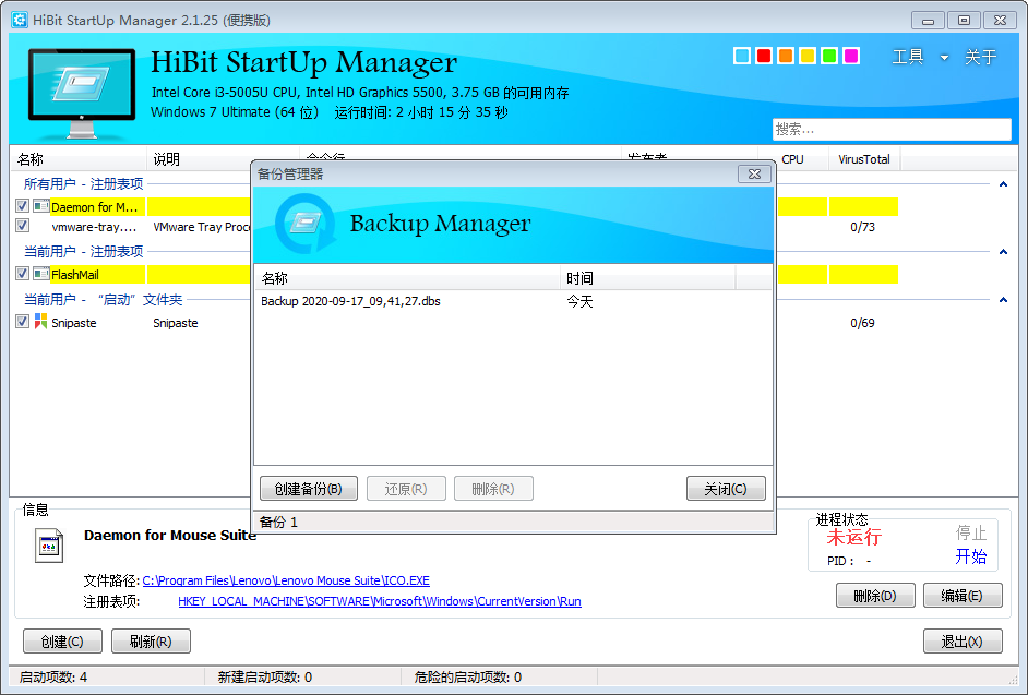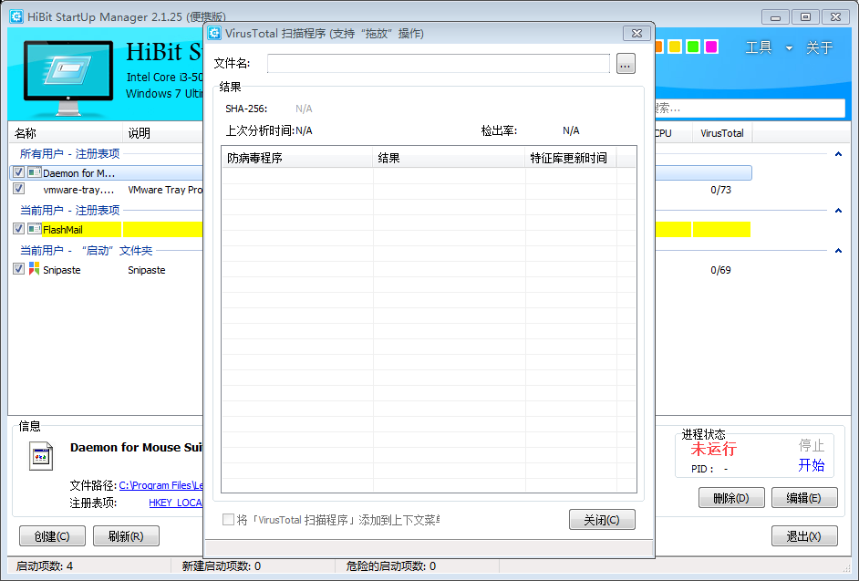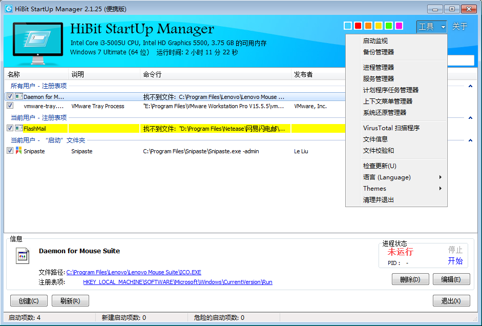 HiBit Startup Manager 使管理启动程序非常简单。 启动时,每个启动项的顶部都会显示一个列表,底部显示详细信息。 还有所有启动项目的列表,包括新的和潜在的危险程序。 单击任何程序,就可以选择删除,编辑,启用或禁用。