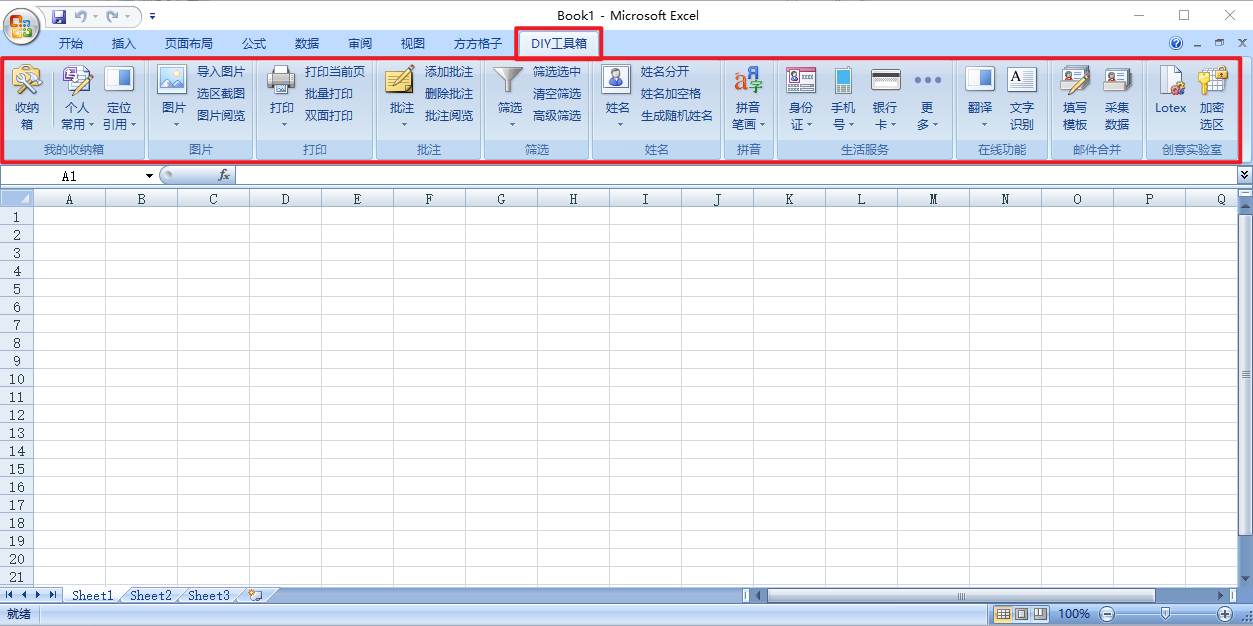 软件安装后提供以下功能:常用的文本处理、编辑、工作表、数据分析、视图工具、收纳箱、汇总拆分、打印、图片、姓名、身份证工具、拼音、翻译、邮件合并。