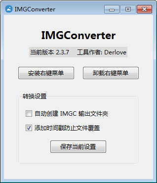 安装说明:软件为单个 EXE 文件,请把它放在一个固定的位置,且路径中不能有空格。运行软件后,点击“安装右键菜单”按钮即可生效。可以进行偏好设置,点击保存即可生效。当你不想用时可以点击“卸载右键菜单”,即可在菜单中删除“IMGConverter”字样。当你安装好右键菜单后,不要移动此 EXE 文件,如需移动,请重写打开软件进行安装。