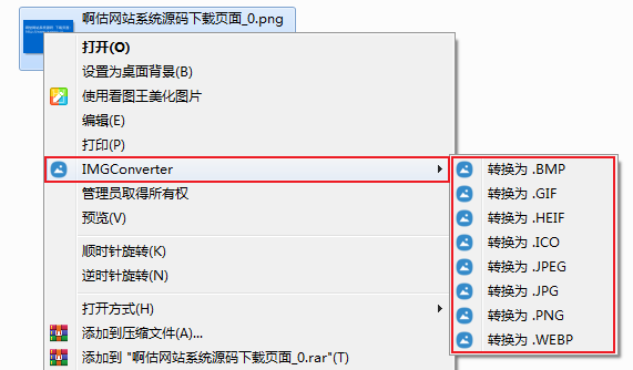 IMGConverter,右键菜单一键图片格式转换。支持图片格式:BMP、GIF、ICO、JPG、JPEG、PNG、WEBP、HEIF。