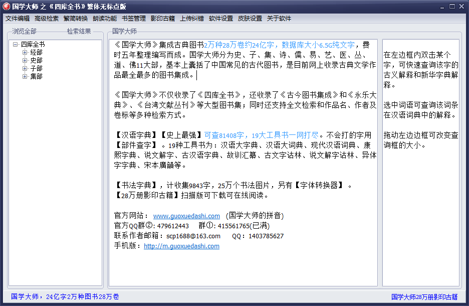 《国学大师》集成古典图书2万种28万卷约24亿字,数据库大小6.5G纯文字,费时五年整理编写而成。国学大师分为史、子、集、诗、儒、易、艺、医、丛、道、佛11大部,基本上囊括了中国常见的古代图书,是目前网上收录古典文学作品最全最多的图书集成。