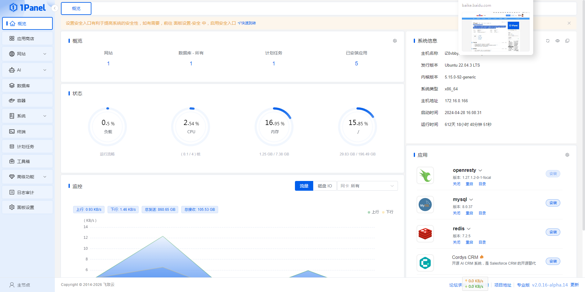 现代化开源Linux服务器运维管理面板。1Panel 是杭州飞致云信息科技有限公司开发的开源服务器管理工具,支持通过 Web 浏览器实现 Linux 服务器运维管理。该产品可深度集成 WordPress 和 Halo 等应用,提供域名绑定、SSL 配置等建站功能,支持主机监控、容器管理、安全审计等运维场景。截至2025年3月,其 GitHub 项目已获超2.5万Star,安装部署次数突破120万次。