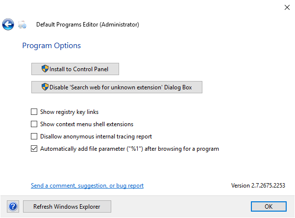 附加功能:禁用“为未知扩展名搜索网络”对话框,独立实用程序,或安装为控制面板小程序,对系统注册表进行直接更改,或者将编辑导出为.reg 文件。