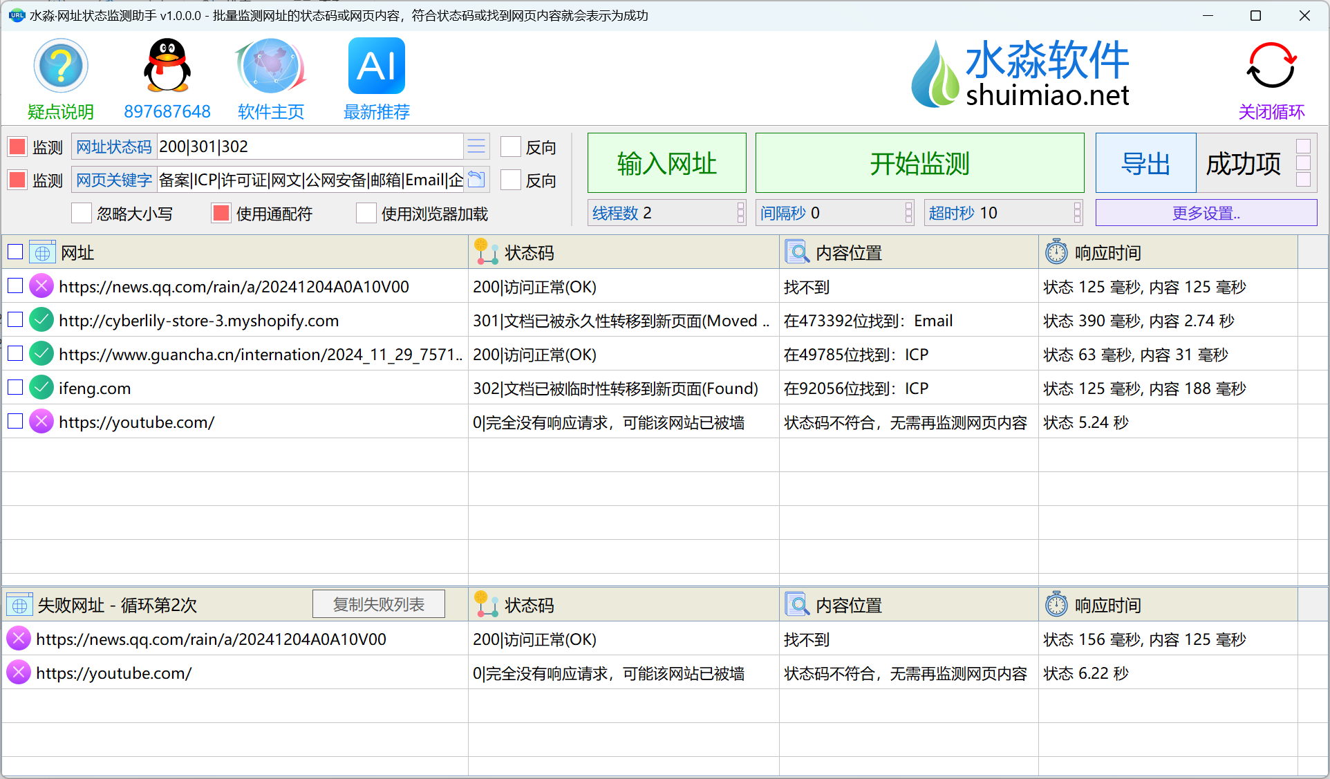 水淼软件出品的批量监测网址状态和网页关键字以判断有效性的工具。筛选失效被黑受限宕机,批量筛选失效网页、被搜索引擎限制的关键词、未收录的网址等等。多线程监测网址的指定状态码和网页内容是否出现指定关键字,符合设定值就会标记网址是成功的,可以监测大量网站的运行状态(成功或失败)。可以循环监测并单独列出失败网址,如果你有几百几千甚至几万个网站,那就一定需要实时掌握每个网站是否能正常访问。本软件的循环监测可以多线程二十四小时动态监控网站的访问情况,并将不正常的网站单独列出以供排查纠正。可筛选出失效网页、被搜索引擎限制的关键词、未收录网址。 |